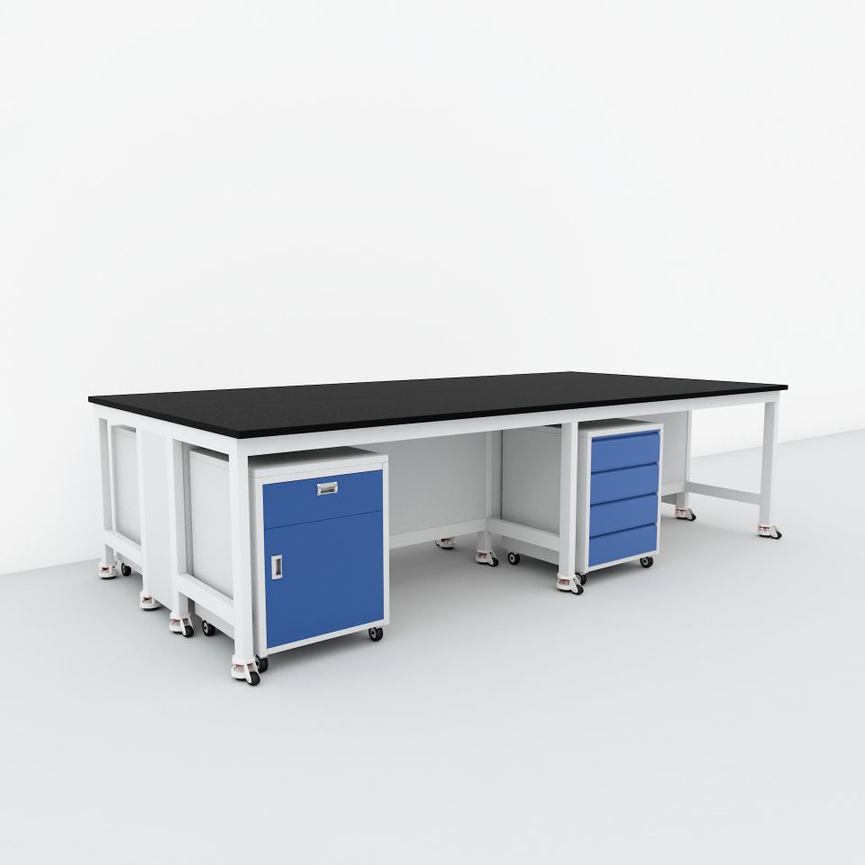 The H-Frame/Modular Lab Bench is supported by a solid H-Frame steel frame, connecting the upper and lower cabinet units and the countertop. Optional mobile cabinet, no cabinet and suspended cabinet structure.