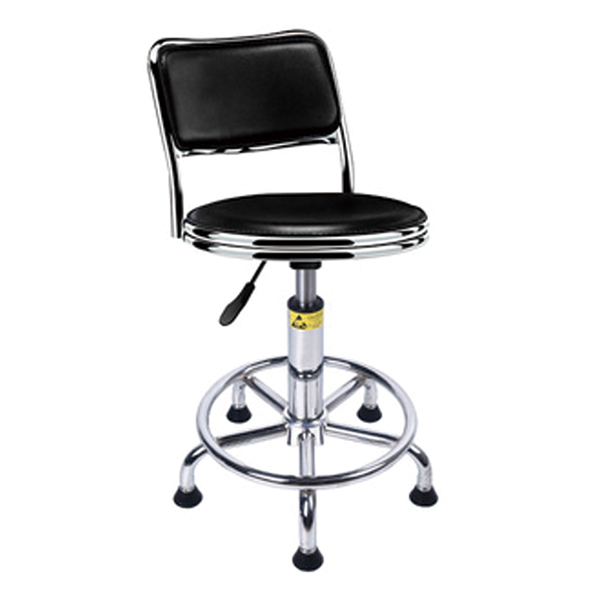 This bench-height PU leather lab stool features a supportive backrest and a foot ring to reduce fatigue during longer tasks. The PU leather upholstery is wipeable and suitable for hygiene-focused spaces. A stable 5-leg base with non-marking glides provides secure seating at higher worktops, ideal for instrument rooms, training labs, and QC benches.