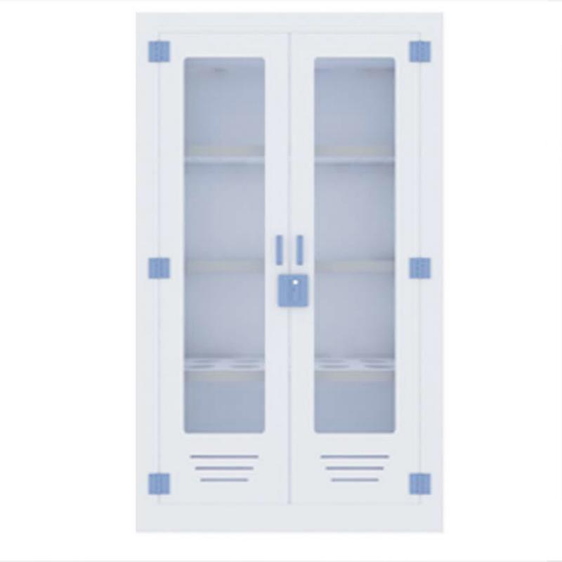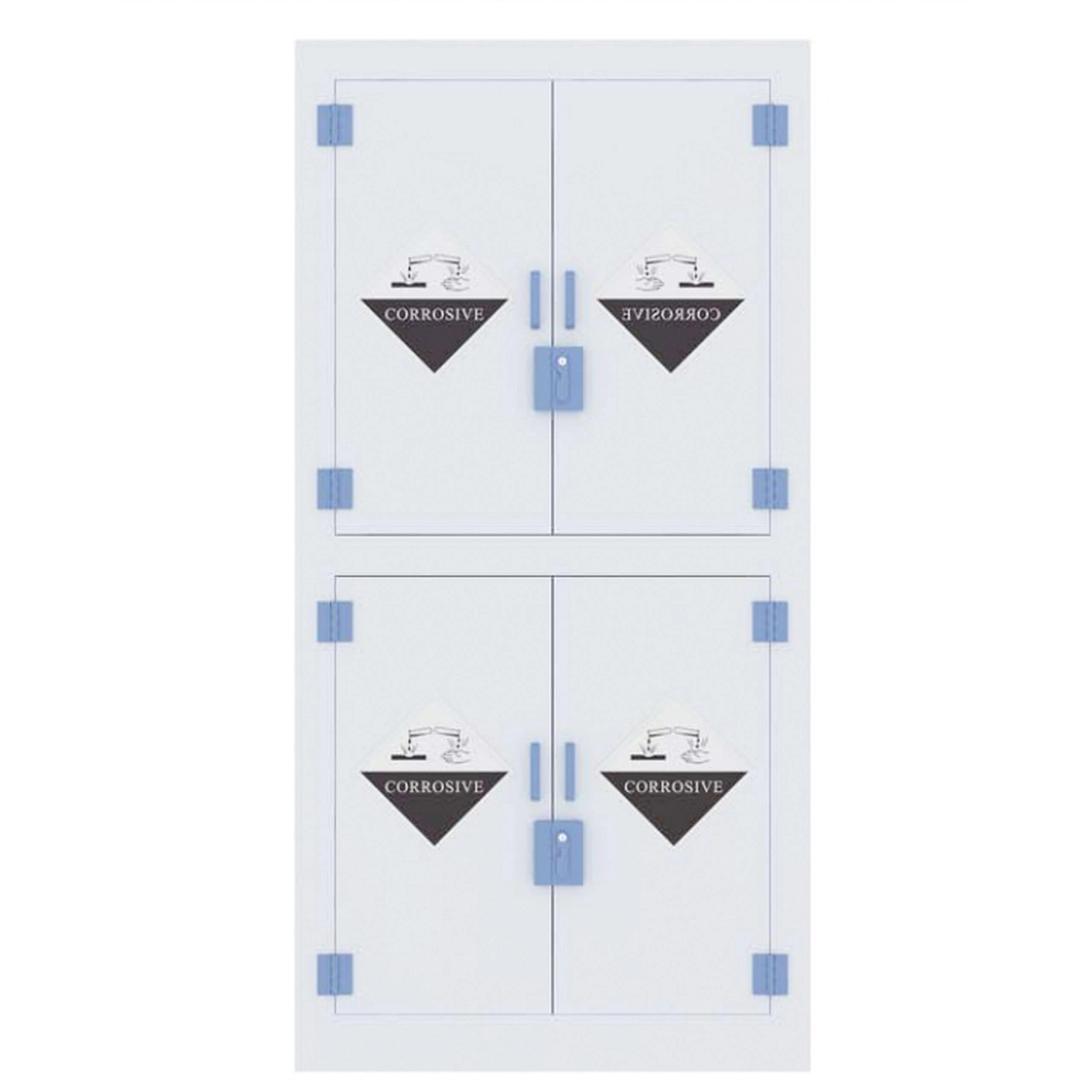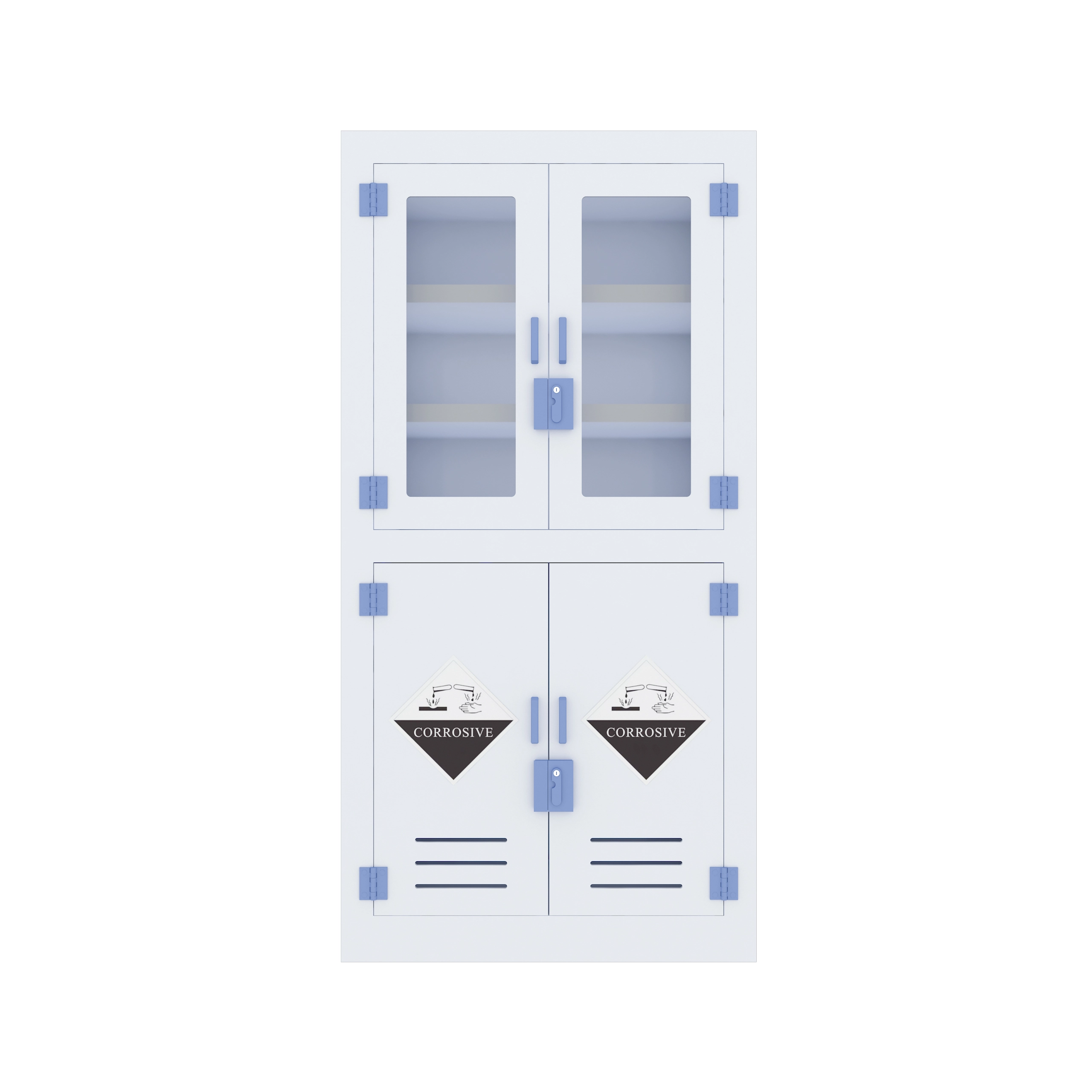 Inside, adjustable PP shelves allow flexible storage of different vessel sizes, from small reagent bottles to larger carboys. Integrated spill lips help contain minor leaks, while optional perforated shelves improve ventilation around stored containers. The non-metallic structure avoids rust and is ideal for wet labs, chemical rooms and areas where metal cabinets would quickly corrode.