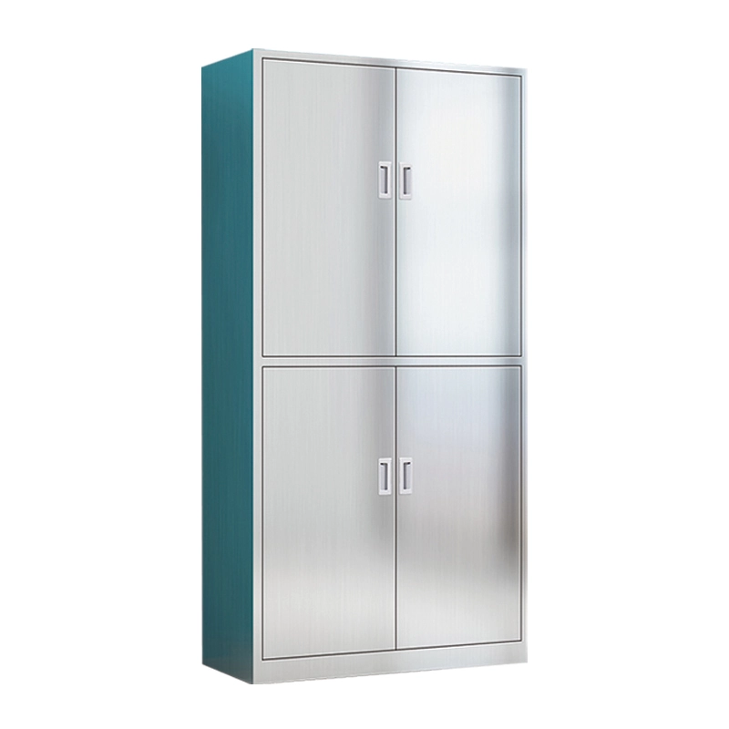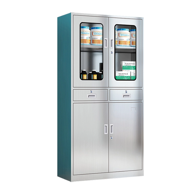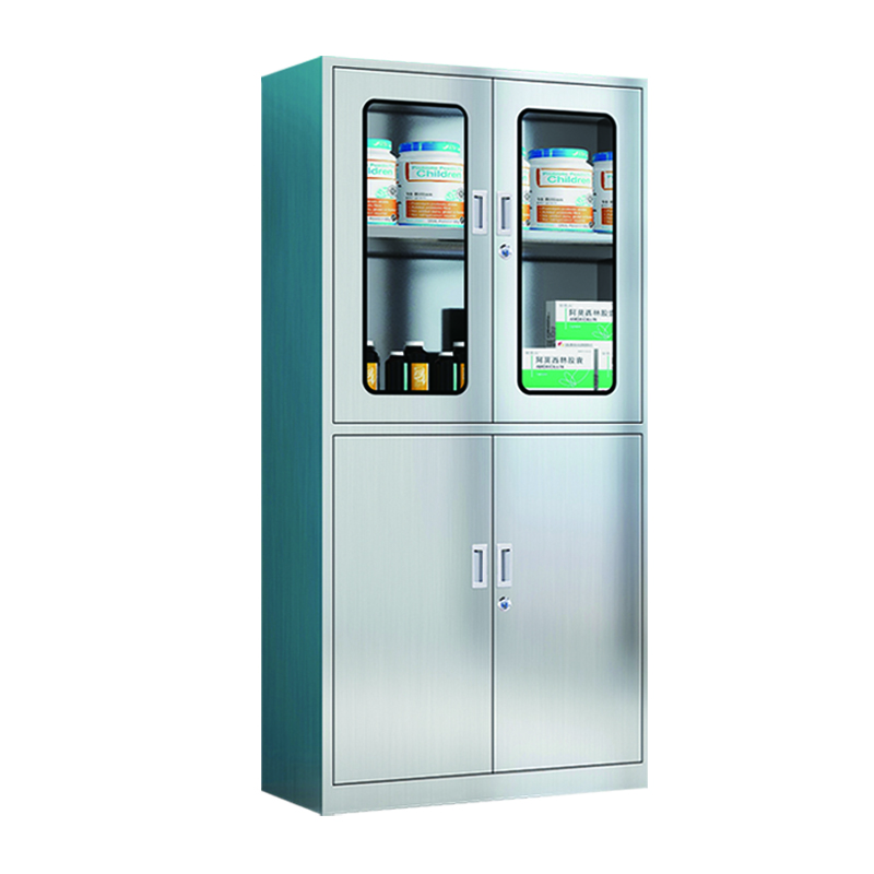 SSMC-02 features an asymmetrical glass door design on the upper section, giving a modern look while still providing practical viewing of the contents. The lower double doors offer enclosed storage for larger packages or equipment. The full stainless steel construction provides excellent corrosion resistance and durability in medical and laboratory environments. Integrated handles and a quality lock system ensure safe, comfortable daily operation for healthcare staff.