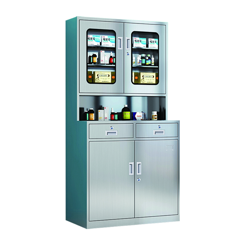 SSMC-08 integrates upper glass doors, a central open work shelf and a lower solid cabinet. The upper section provides visible storage for medicines, the middle open area serves as a convenient dispensing or temporary placement space, and the bottom doors hide bulk stock. Two locking drawers offer extra room for small or high-value items. This all-in-one design is ideal for outpatient rooms, community clinics and treatment areas.