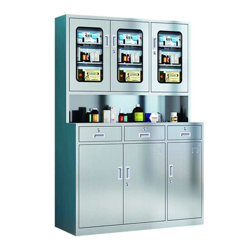 SSMC-10 is a multifunctional stainless steel medicine cabinet combining three glass doors on the top, an open central work shelf and a large base cabinet with three drawers and three lower doors. The upper glass compartments provide clear visibility of stored medicines and health products, helping staff locate stock quickly. The middle open area works as a convenient dispensing surface or temporary storage space, while the lockable drawers are perfect for small or high-value items. The lower cabinets offer generous enclosed storage for larger boxes and backup supplies. With its durable stainless steel construction and professional appearance, SSMC-10 is well suited for hospital pharmacies, clinics and community health centers.